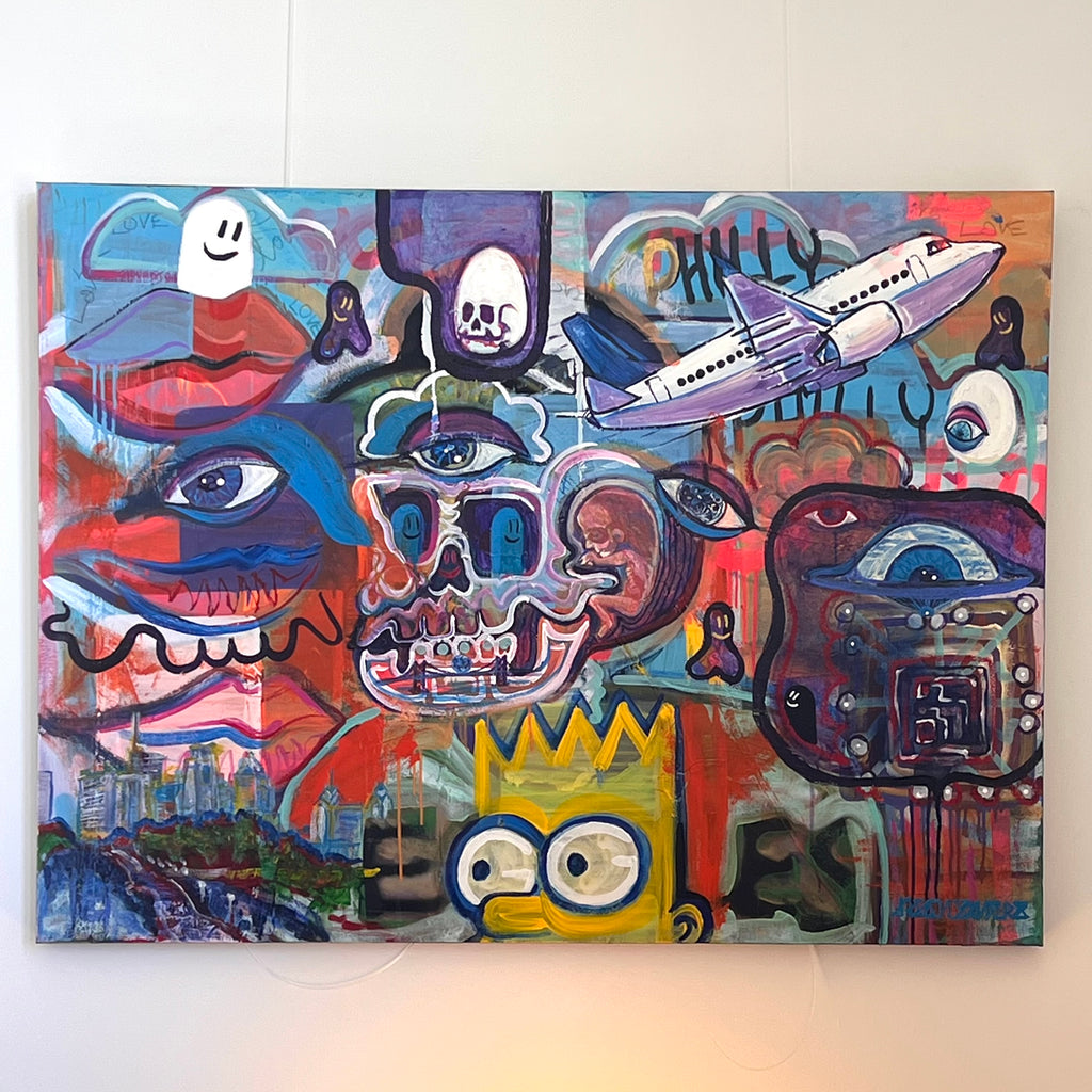 The Philadelphia skyline anchors the composition, rising among skeletal elements, spirits, lips, and eyes. Unexpected imagery punctuates the scene: the top of Bart Simpson’s head, the electric chip of the Bugasphere, and the presence of multiple Sparkies. Each detail adds to the painting’s playful yet spiritual energy, inviting the viewer into a layered adventure of vision and meaning.
