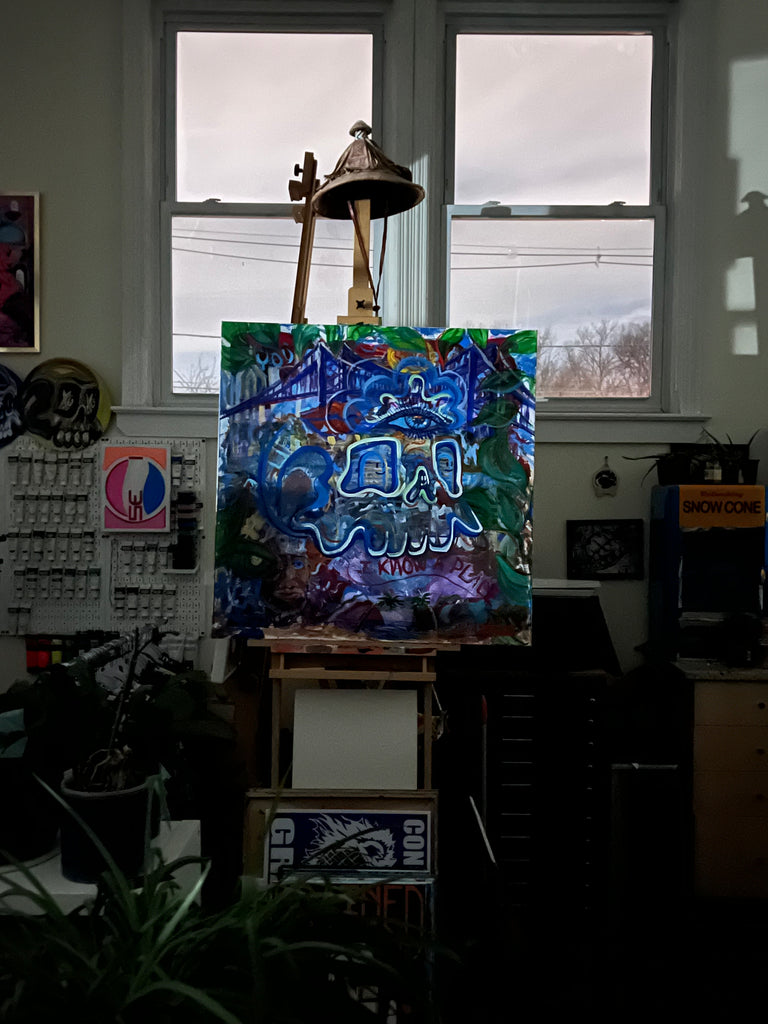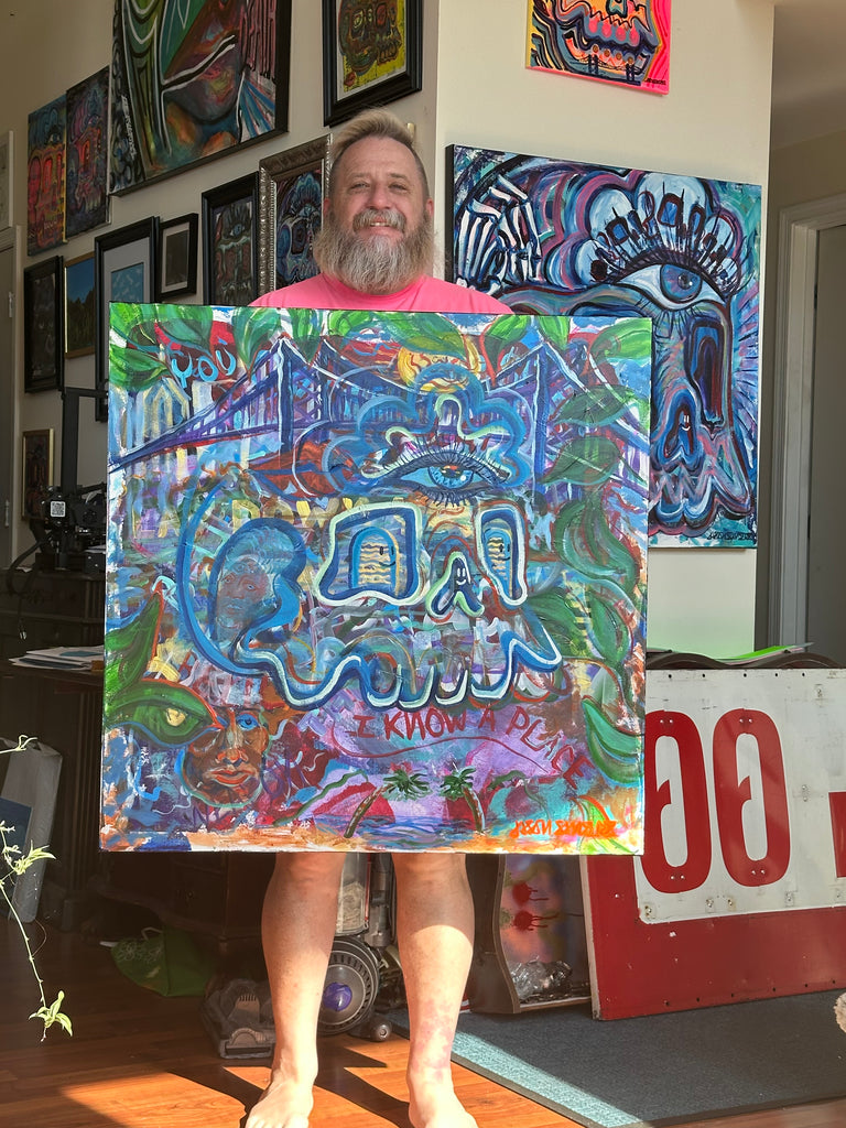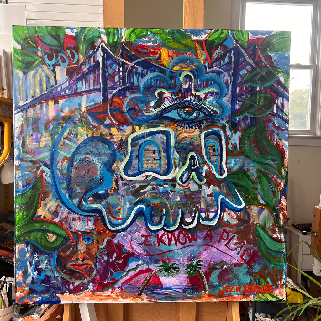 I Know A Place is a vibrant reflection on travel, memory, and connection, painted in acrylic on a 36”x36” stretched canvas. At its center sits one of DrainedEye’s iconic skulls, complete with third eye, Sparkie, spirits in the eyes, and a guiding spirit, framed by lush leafy elements that guide the viewer’s perspective.