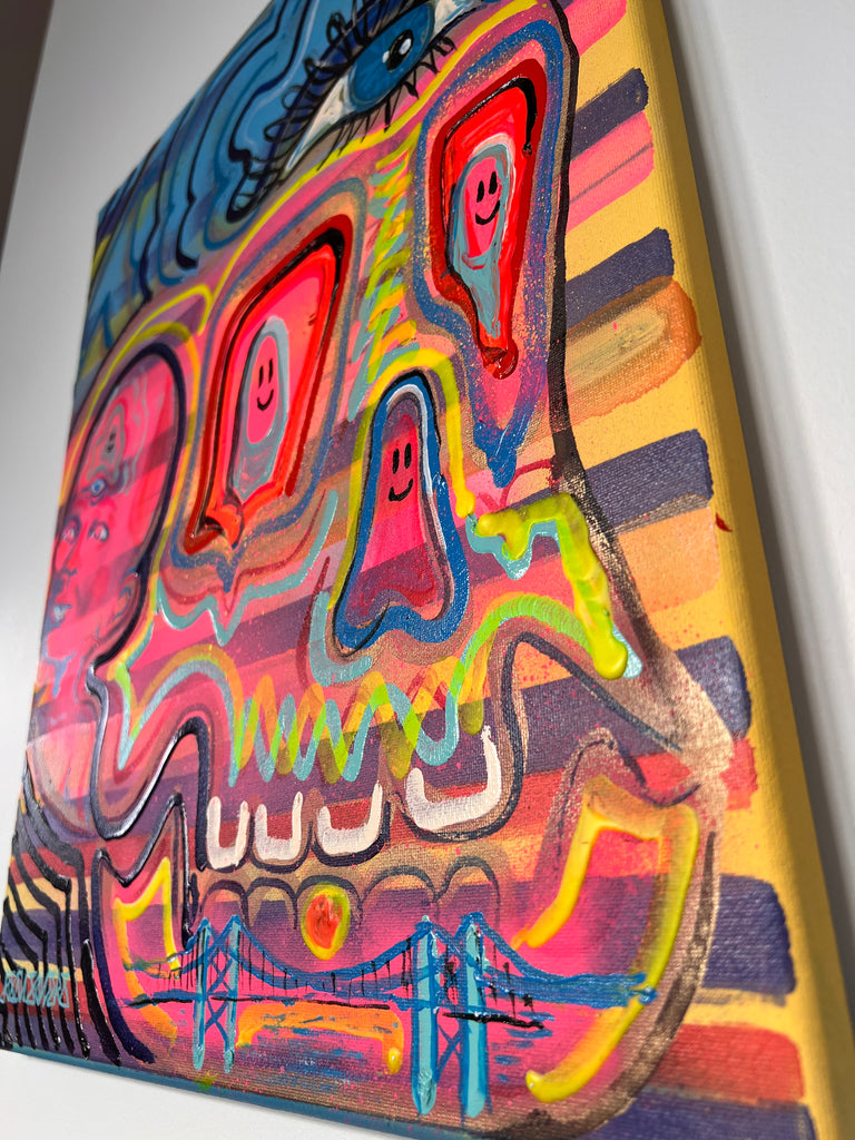 Of All Stripes is a layered exploration of spirit, identity, and symbolism. Painted in acrylic and spray paint on a 16”x20” stretched canvas, the work features an iconic skull set against a bold background of horizontal stripes. The stripes remain visible through the composition, weaving history and energy into the image.