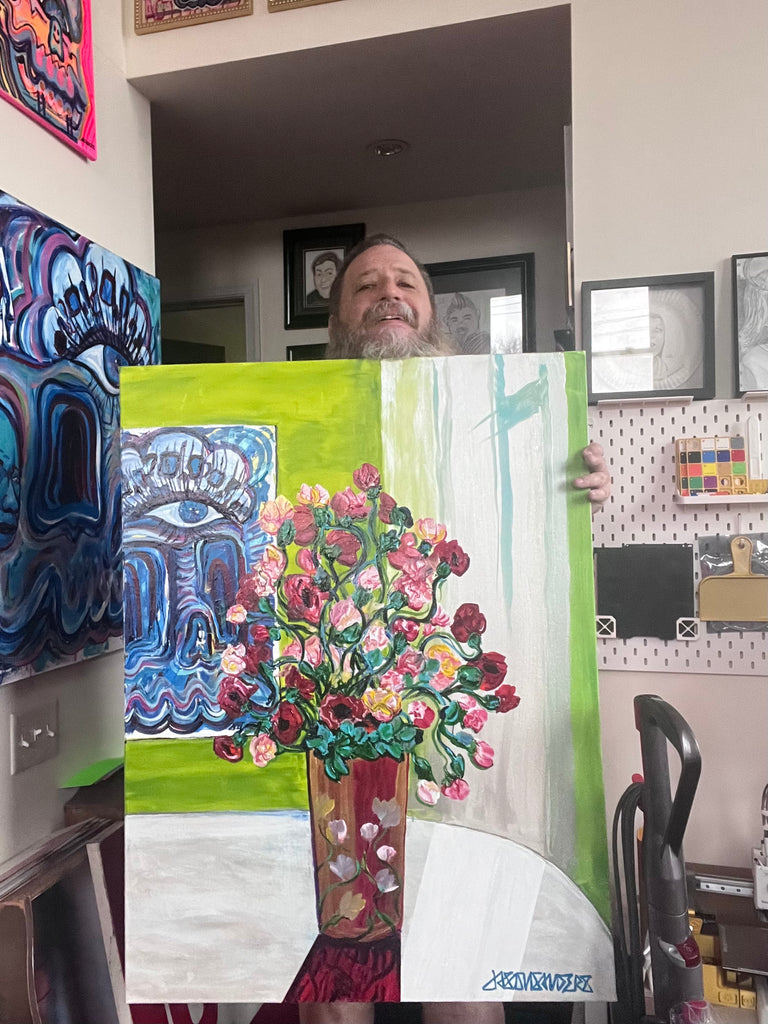 Behind the bouquet lies a deeper layer: a nested image of DrainedEye’s earlier painting, Generative, reimagined inside the composition. This use of mise en abyme — a painting within a painting — bridges two works together, linking growth, memory, and artistic lineage into a single vision.