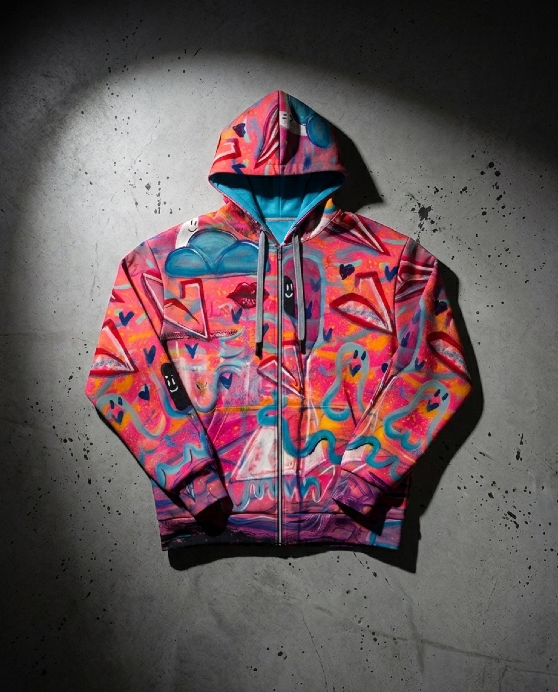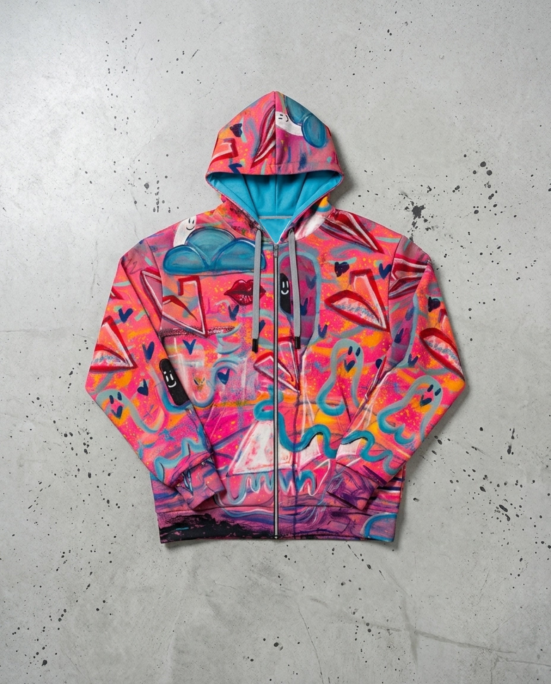 This garment features a translated image of Love Is In The Air, an original painting by DrainedEye. The artwork explores themes of romance, saturation, and energetic presence through layered color and floating forms. Rather than replicating the painting, the piece extends its presence — allowing the work to move through the world and evolve through lived interaction.