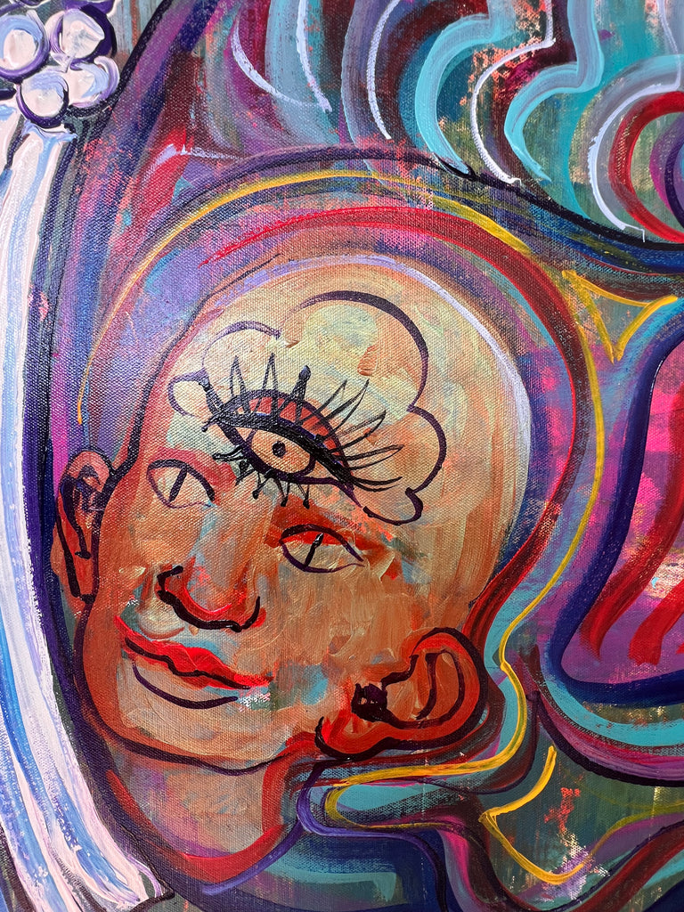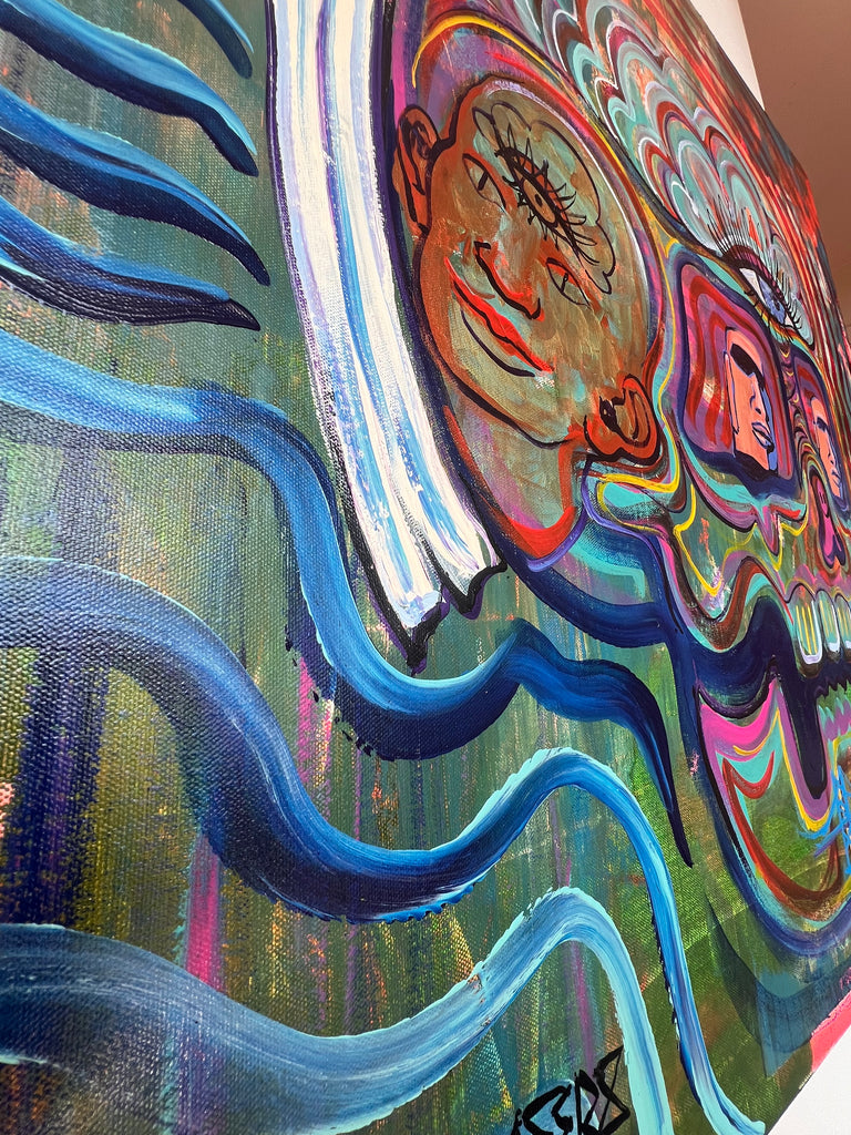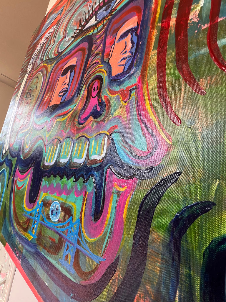 Sacred Origins is part of DrainedEye’s Icon Skulls series, a 36”x36” acrylic painting that explores mystery, symbolism, and cosmic connection. At its heart is an iconic skull, complete with a third eye, Sparkie in the nose, a bridge and moon across the chin, and an extraterrestrial spirit guide.