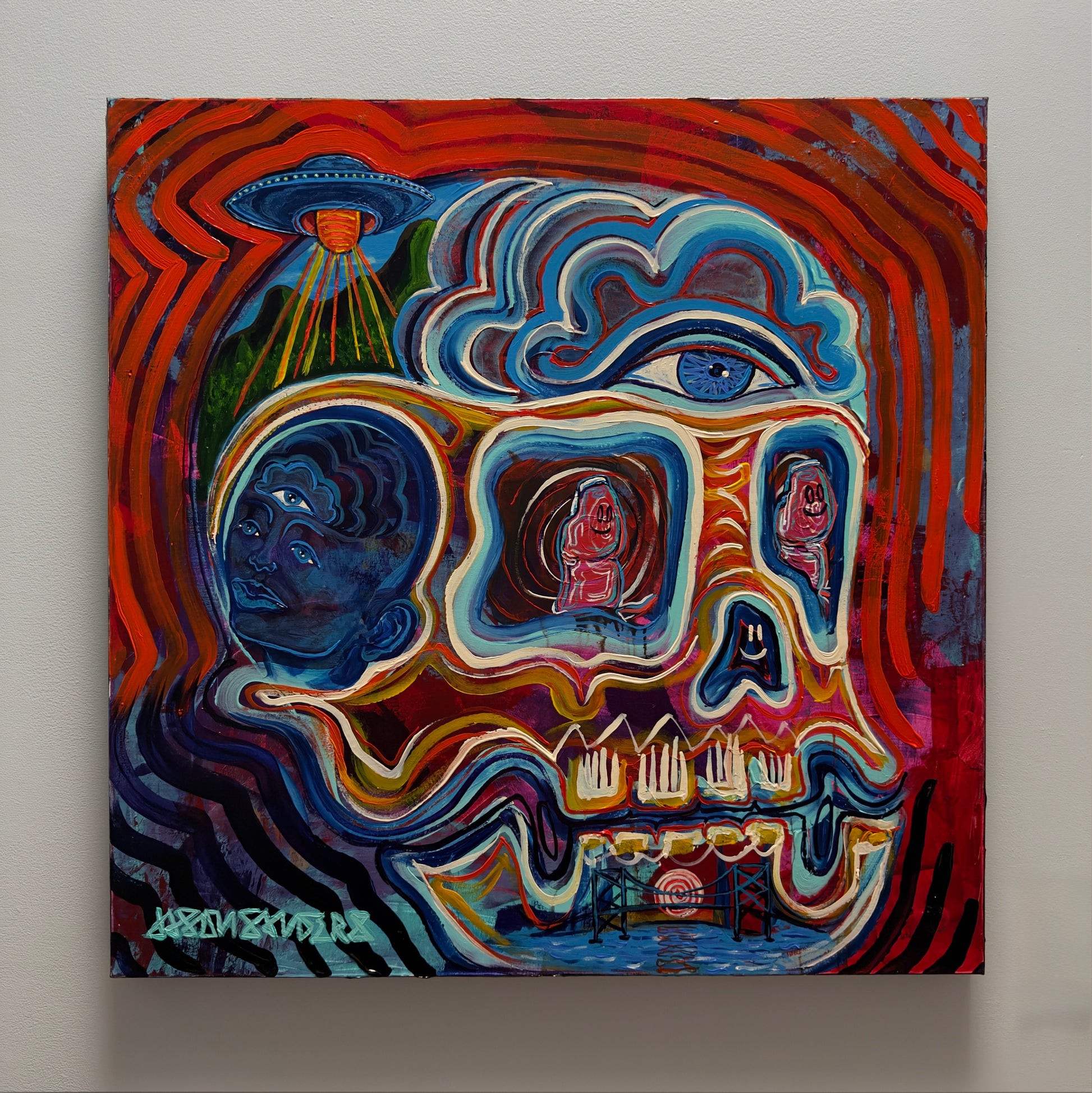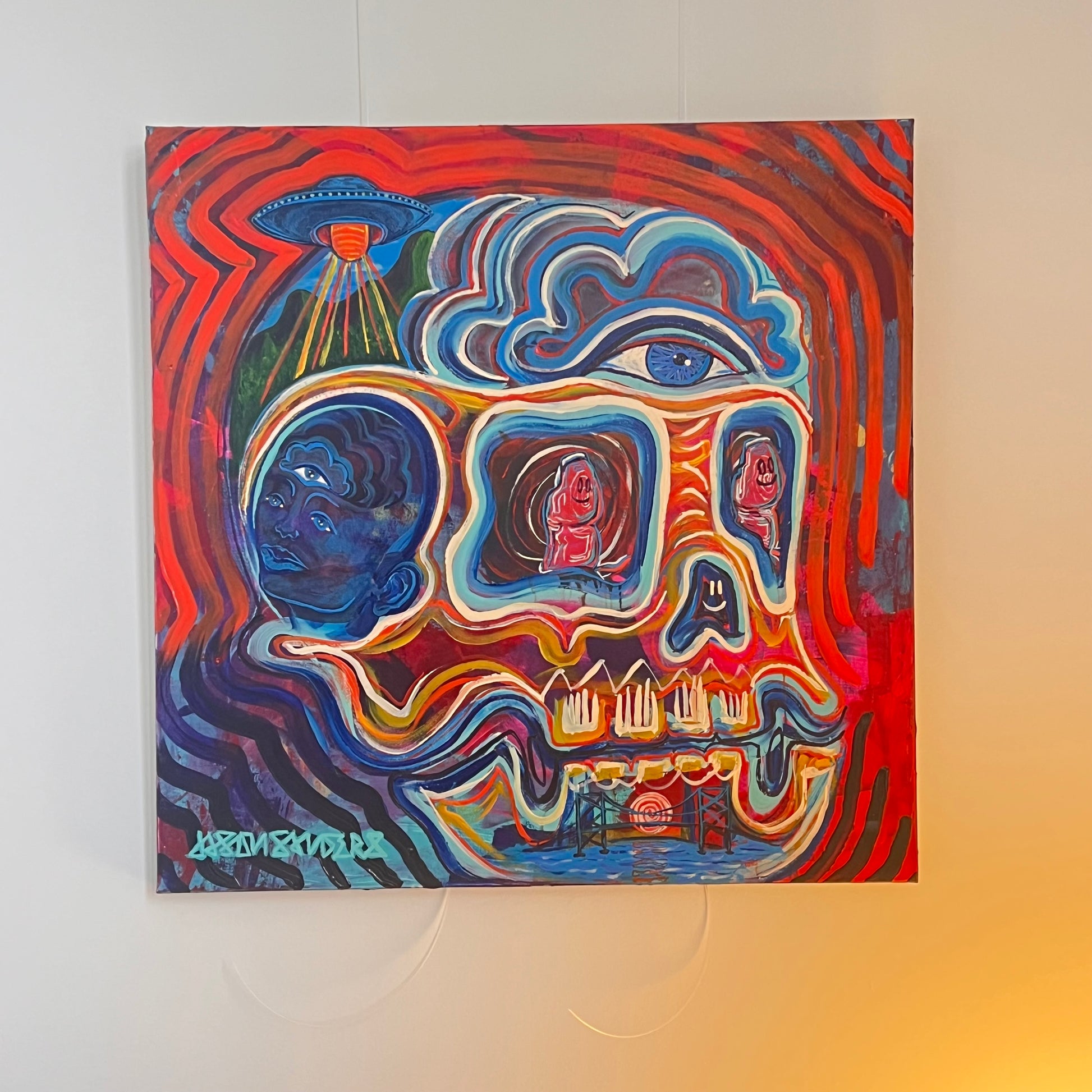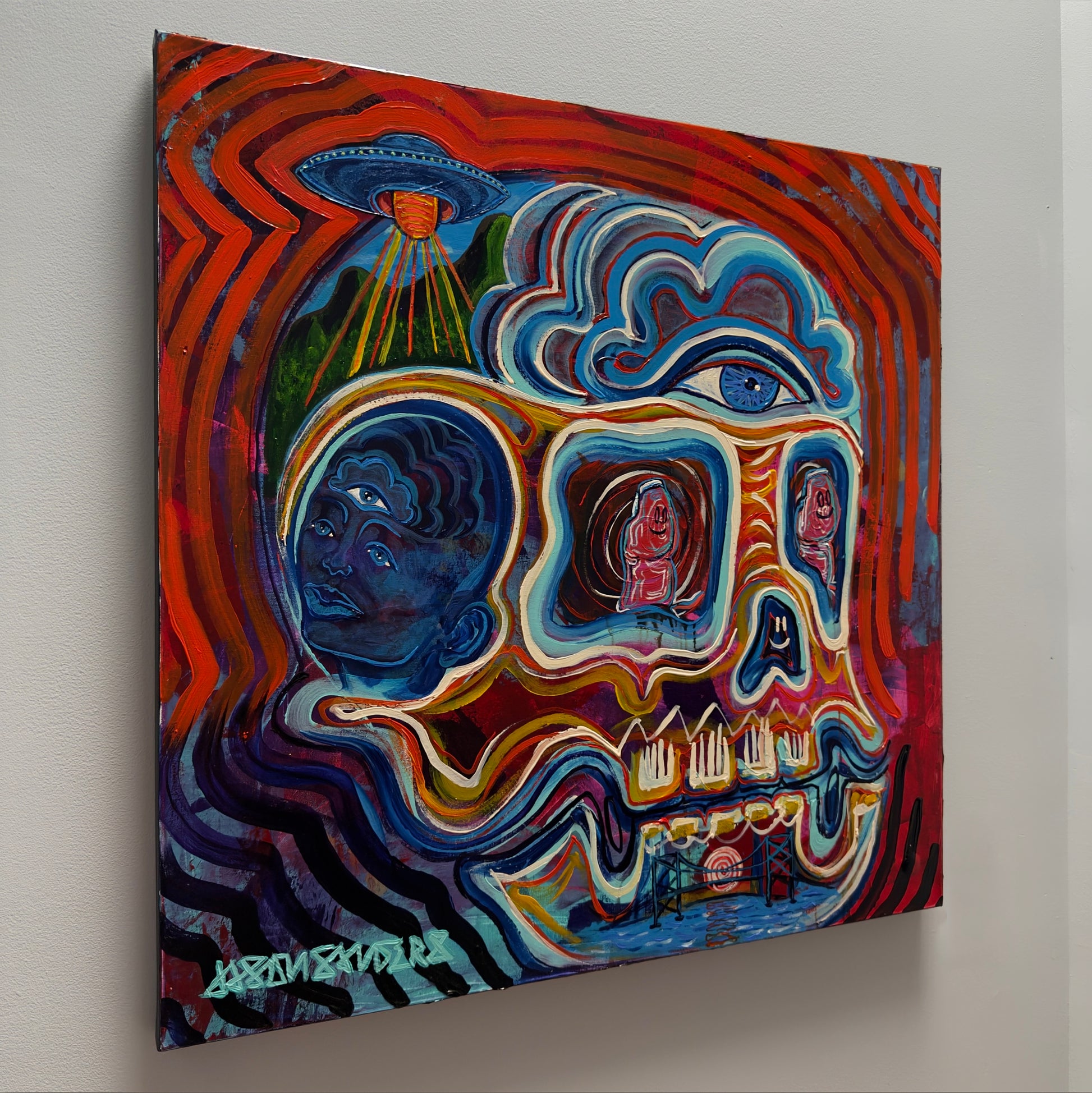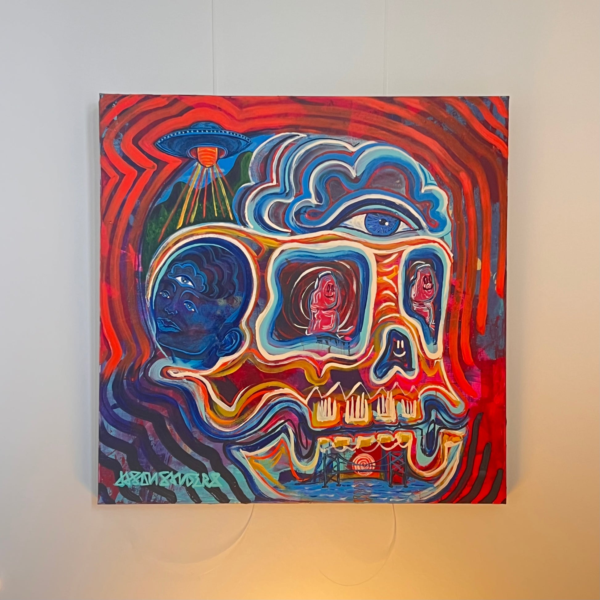 ‘Two Thumbs Up’ sits at the intersection of humor, humanity, and higher vision. At its center, a skull radiates red and blue frequency, holding duality in motion and color. Within its eyes, two glowing thumbs replace the expected spirits—symbols of touch, effort, and the grounding force of the physical world asserting itself in a sacred space.