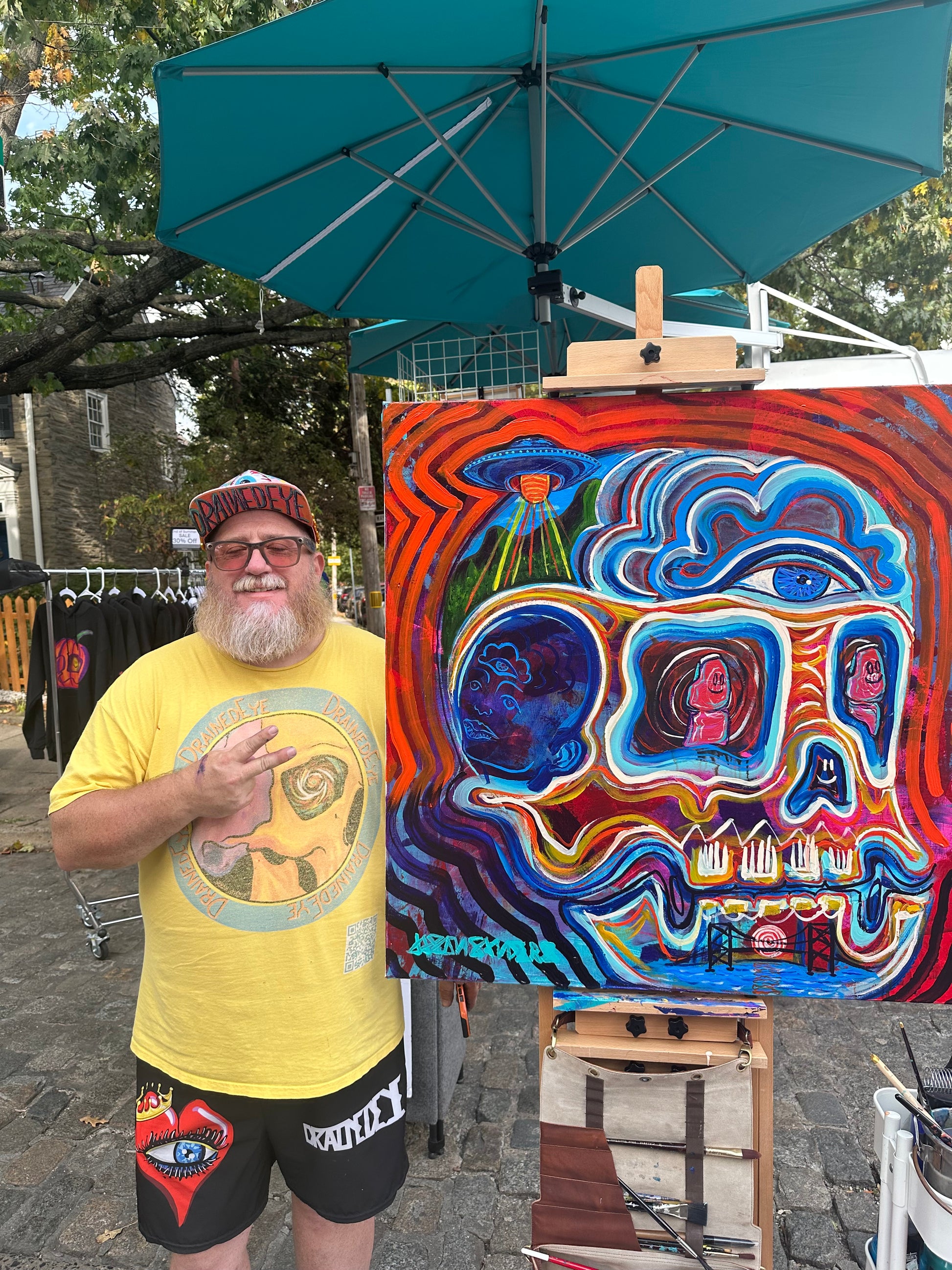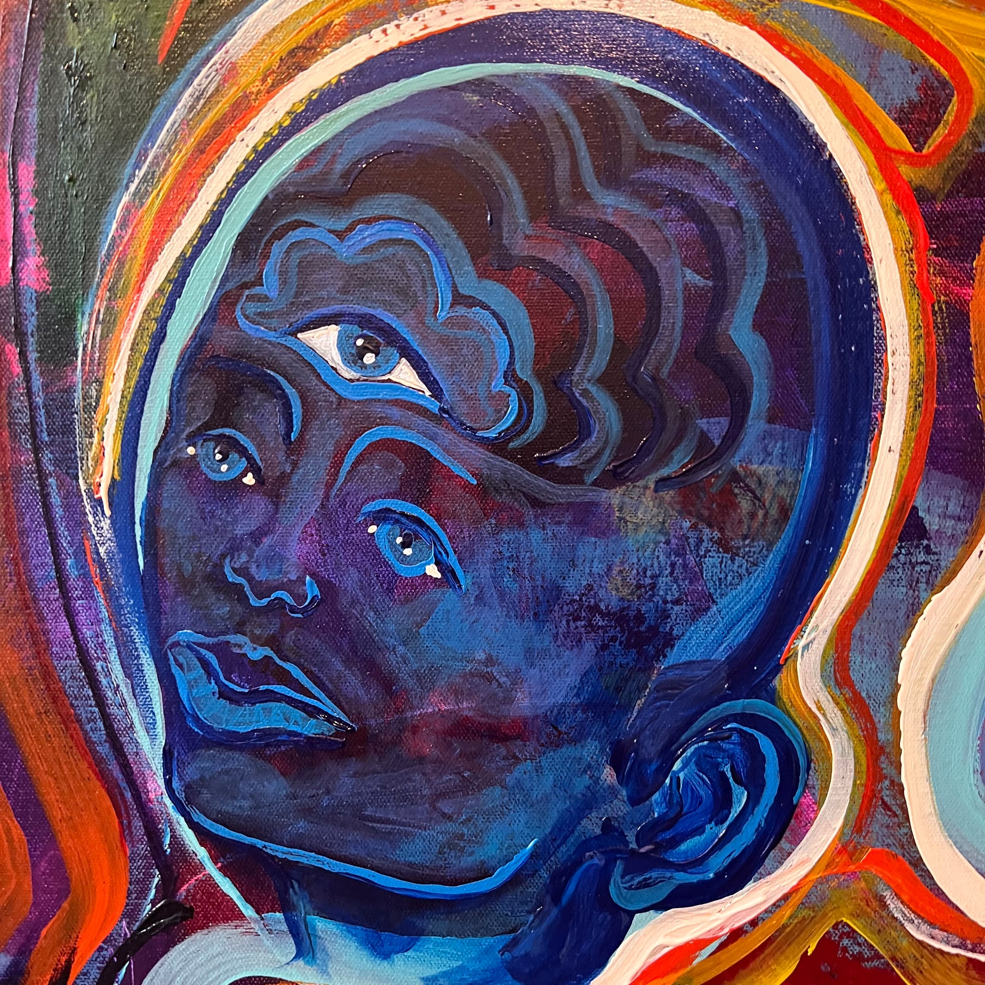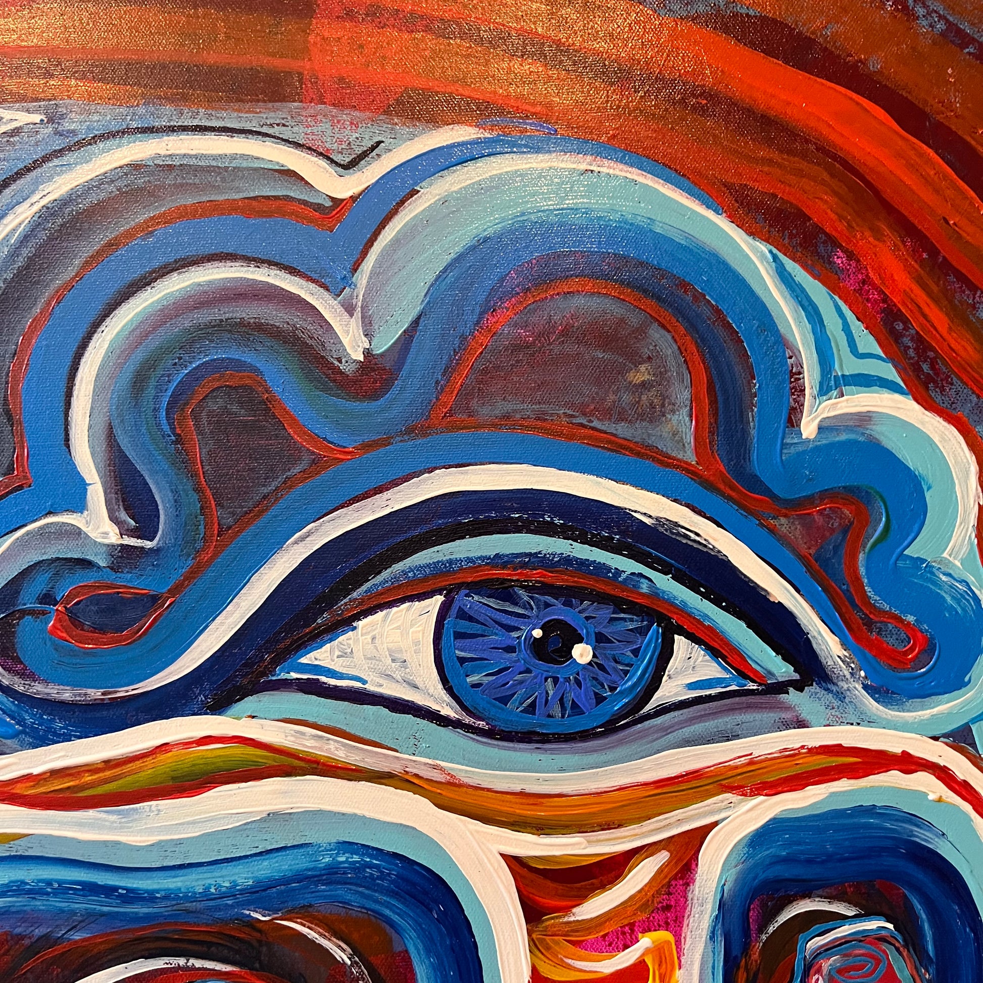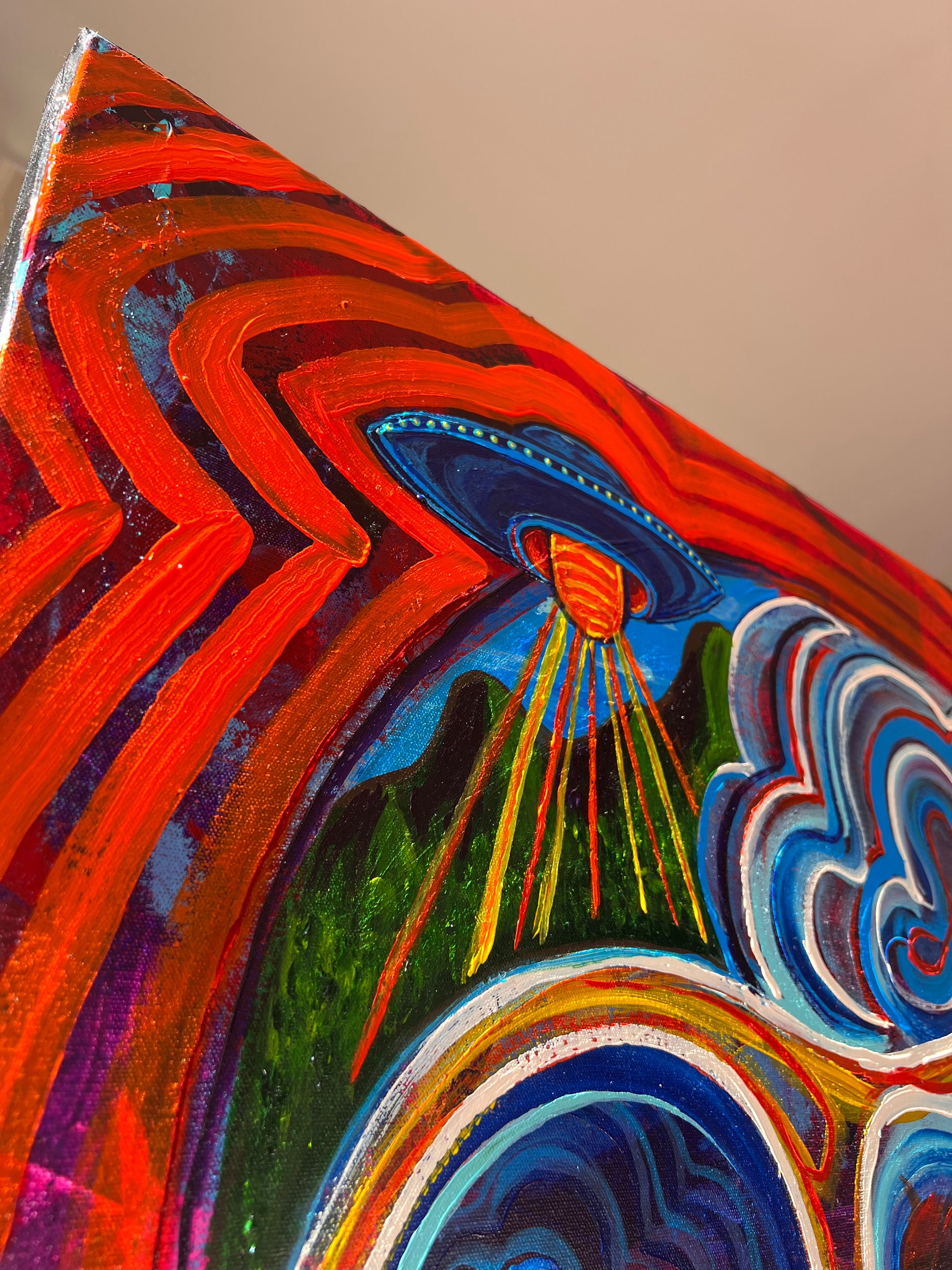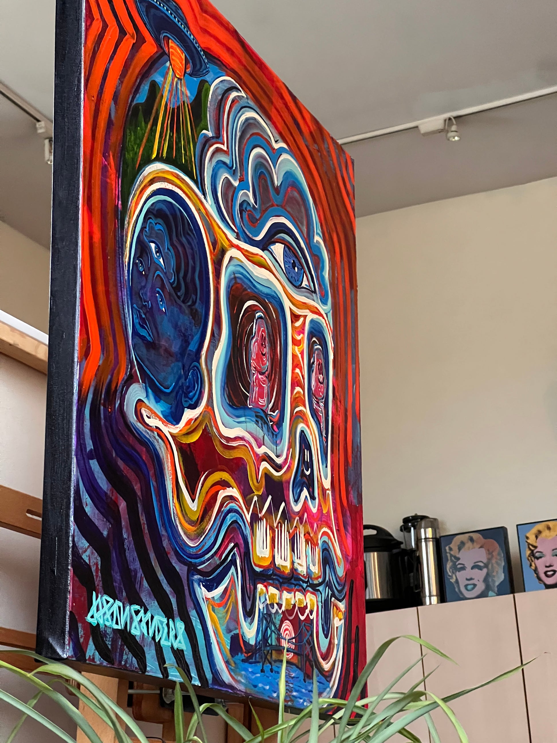 ‘Two Thumbs Up’ sits at the intersection of humor, humanity, and higher vision. At its center, a skull radiates red and blue frequency, holding duality in motion and color. Within its eyes, two glowing thumbs replace the expected spirits—symbols of touch, effort, and the grounding force of the physical world asserting itself in a sacred space.